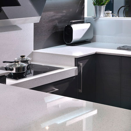 Technistone. Коллекция Translucent. В производстве агломератов используется зеркальный гранулят, поэтому поверхности этой серии глянцевые с блестящим зеркальным эффектом. Преимуществом данной линии является довольно нетрадиционный внешний вид, что позволяет создавать продукцию с высококлассным отражением в сочетании с классическими материалами. |